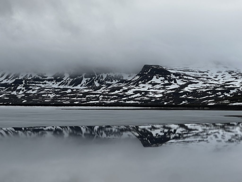 Next Stop: Iceland. After a calm ferry ride across the North Atlantic, we rolled ashore in Seyðisfjörður, 24 hours later but in a whole new world. Jagged fjords, steep valleys, and icy rivers welcomed us as our tires met Icelandic soil. Voukefalas ,The Cruiser? Felt right at home. In the first half an hour we had driven through fog, passed 3 impressive waterfalls and stoped in a frozen lake. Rochelle even had time to make a mini snowman on the front of the car. As for the rest of the day it was eventful. We departed Seyðisfjörður, to hit a gas station in a town whose name we never quite learned, to pick up SIM cards, then ended up eating lunch in an abandoned fish station turned into a unique rustic restaurant. Yes, fermented shark (Iceland’s delicacy) was accidentally ordered. No, it did not become a favourite.