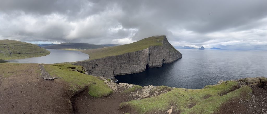 The next day, we visited the show-stopping Múlafossur waterfall where we had our first close encounter with puffins—those clumsy, adorable little birds that live only in these parts of the world. Under an uncharacteristically clear blue sky, it was pure magic. And in the Faroes, magic doesn’t last. That day’s sunshine was rare and fleeting, and we soaked in every second. Our final hike was to Trælanípa, a lake that appears to float impossibly above the ocean. After an easy two-hour trek, we stood breathless at the edge of the cliff, watching the water defy gravity. It was the perfect send-off from a place that constantly challenged what we thought was real.