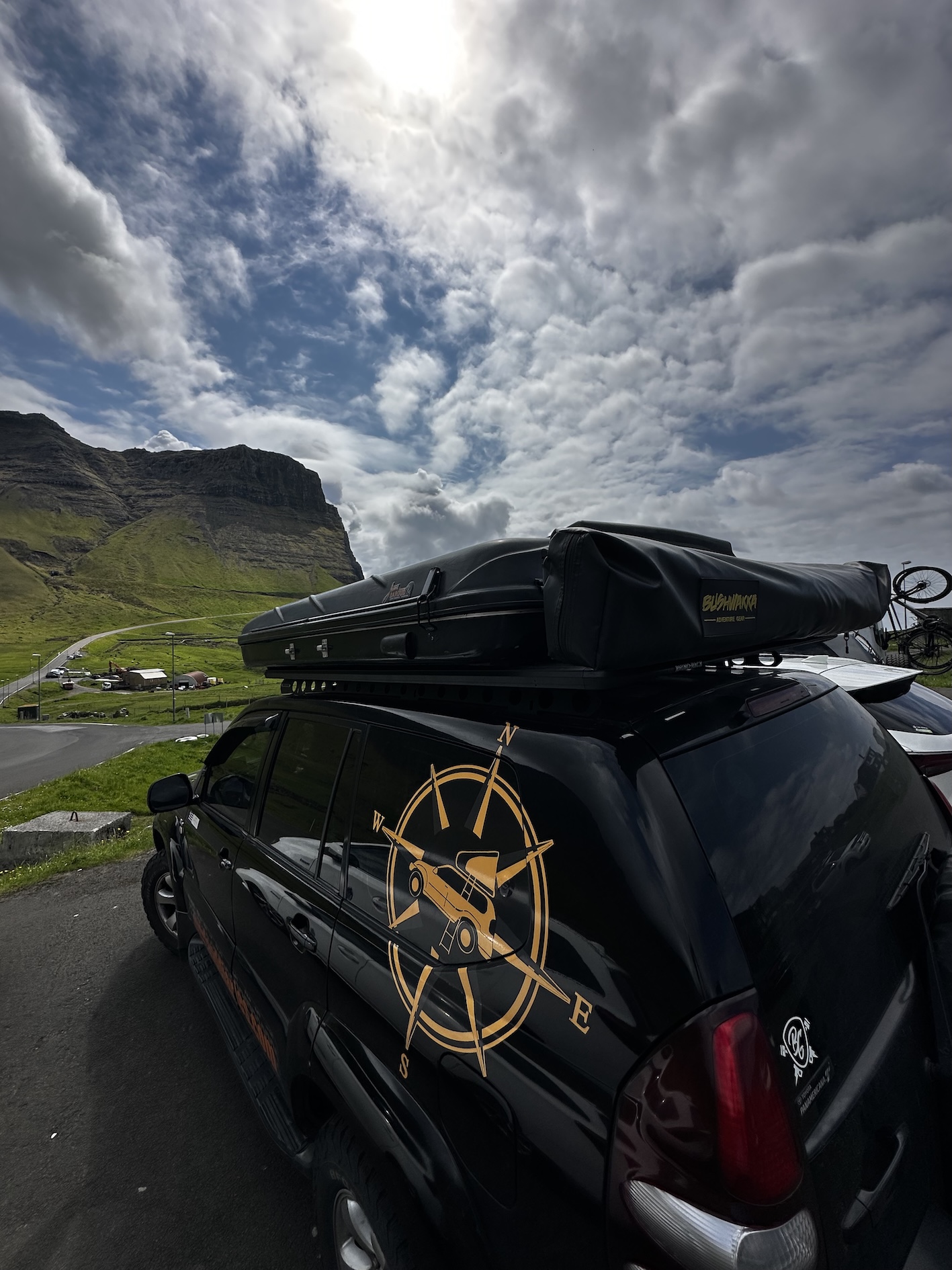 We arrived in Tórshavn close to midnight—11:30 PM to be exact—and yet the sun still hung low in the sky. Landing here with our trusty overland vehicle, Voukefalas, our Land Cruiser, felt less like entering a country and more like stepping directly into a postcard. The air was crisp, the landscape dramatic and strange, and even the sky seemed to hang heavier. Our first challenge? After disembarking, we drove straight to Tórshavn’s campsite, only to be greeted with, “Hello Reservation? No! Sorry, fully booked.” With no backup plan, we turned north. We drove through tunnels carved into mountains, twisting along narrow roads that pass through cliff-hugging villages. Passing houses with grassy turf roofs, looked more like sets from Viking movies than modern dwellings.