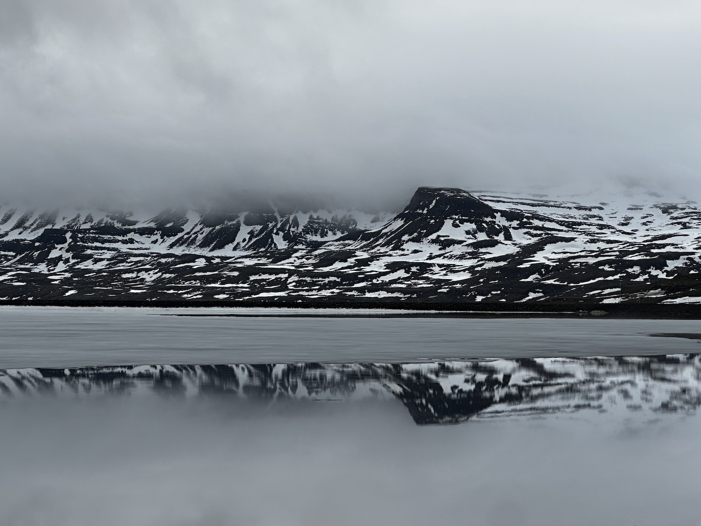 Next Stop: Iceland. After a calm ferry ride across the North Atlantic, we rolled ashore in Seyðisfjörður, 24 hours later but in a whole new world. Jagged fjords, steep valleys, and icy rivers welcomed us as our tires met Icelandic soil. Voukefalas ,The Cruiser? Felt right at home. In the first half an hour we had driven through fog, passed 3 impressive waterfalls and stoped in a frozen lake. Rochelle even had time to make a mini snowman on the front of the car. As for the rest of the day it was eventful. We departed Seyðisfjörður, to hit a gas station in a town whose name we never quite learned, to pick up SIM cards, then ended up eating lunch in an abandoned fish station turned into a unique rustic restaurant. Yes, fermented shark (Iceland’s delicacy) was accidentally ordered. No, it did not become a favourite.